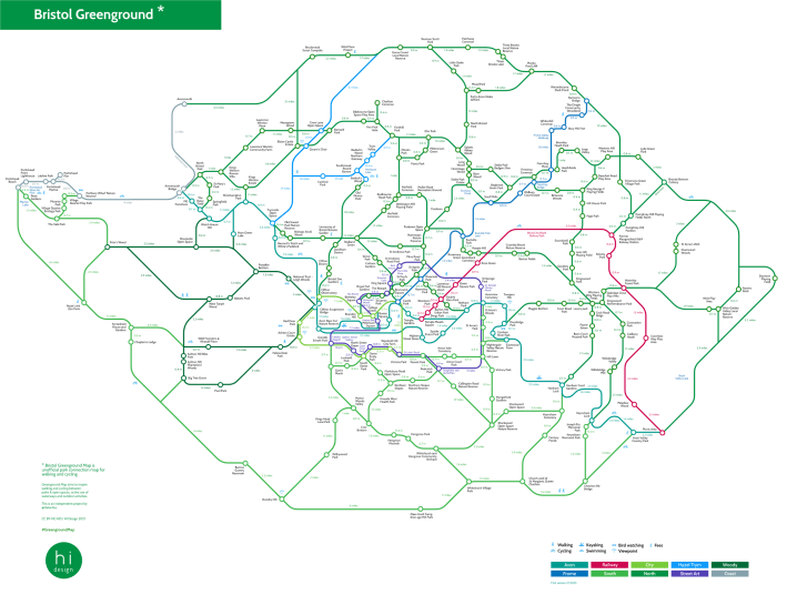 First edition map connecting 250 parks & open spaces with 10 green lines to walk and cycle in and around Bristol.