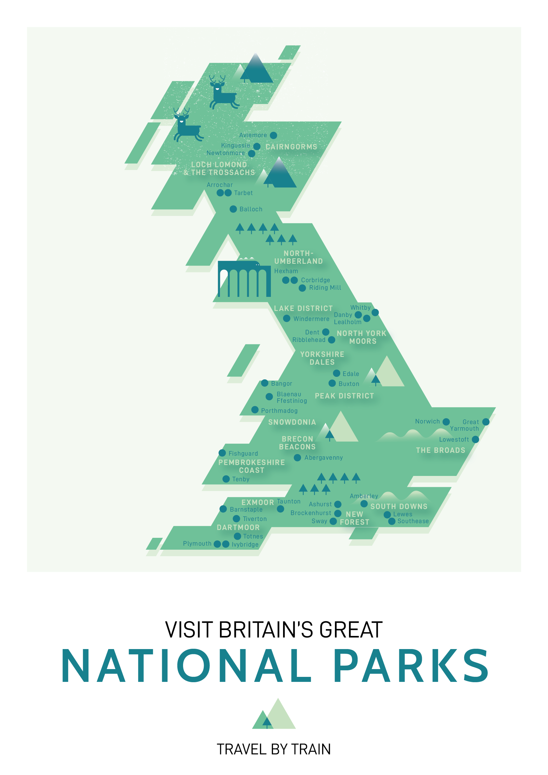 The fictional art posters invite to visit Britain’s fifteen national parks by train and include a stylised map of train stations that are access points to the national parks. The 38 stations can be travelled from towns and cities or even act as connections between parks. Why not to travel the Tenby to Taunton coastline or take a train from beautiful Windermere to Ribblehead Viaduct? The golden age of railways may have passed, but the the new age of train travel is now!