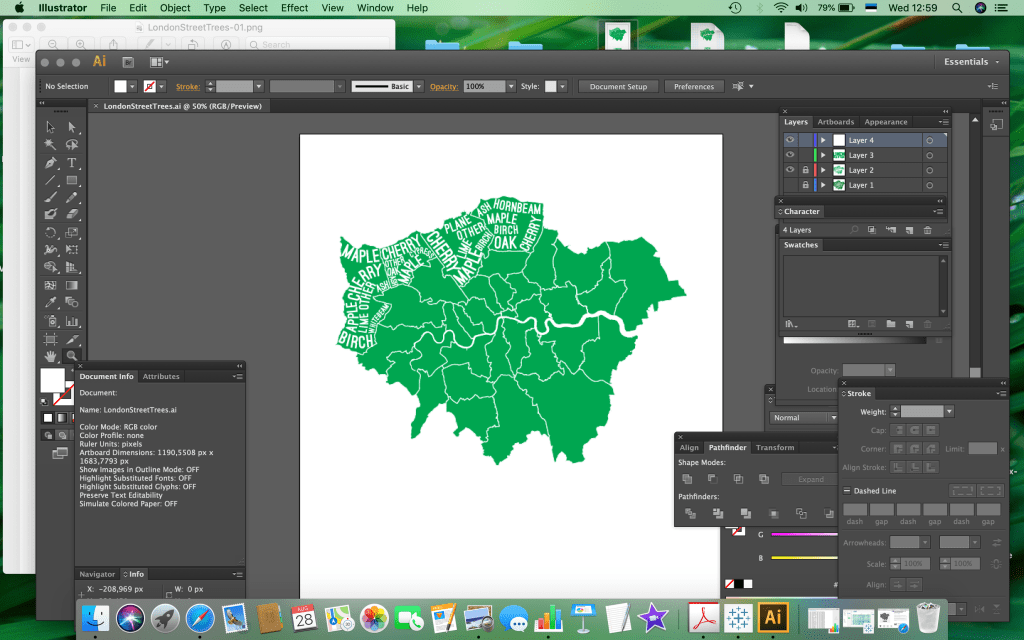 The pre-work done I found an open vector base map of greater London, which I modified slightly, and started to fill in the map digitally. This was straightforward but time consuming task and took me most of the second day to fill out the whole map. I decided to go with primary green colour to keep it clean and fresh. π