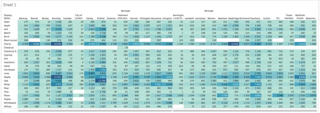 I haven’t used Tableau before and turned out it was easier that I expected. It loaded amazingly quickly (considering the size of the file) and felt really intuitive to use. After setting couple of parameters I ended up with a funky table showing me the number of trees by species in boroughs. It even highlighted the values by colour which made it easier to follow. Magic! π«