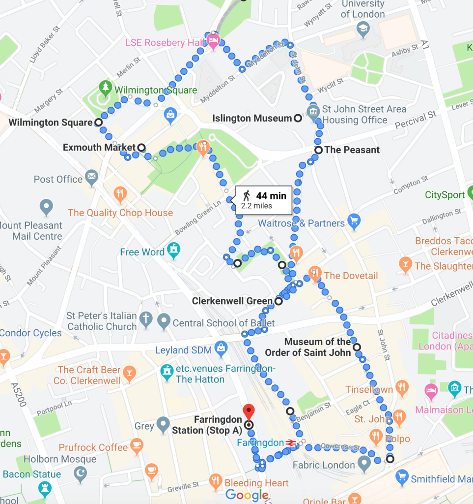 Since it’s been a while I made a proper walking map I felt it was about a time to get back into map making! I chose Clerkenwell as it used to be inside my lunch radius and I spent many happy hours exploring the area over my lunch breaks. Some of the breaks got longer than intended, but I like to think I made it up by staying late.. on most days. 😉