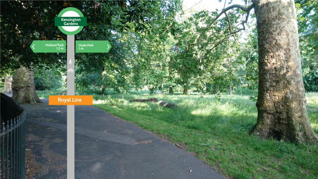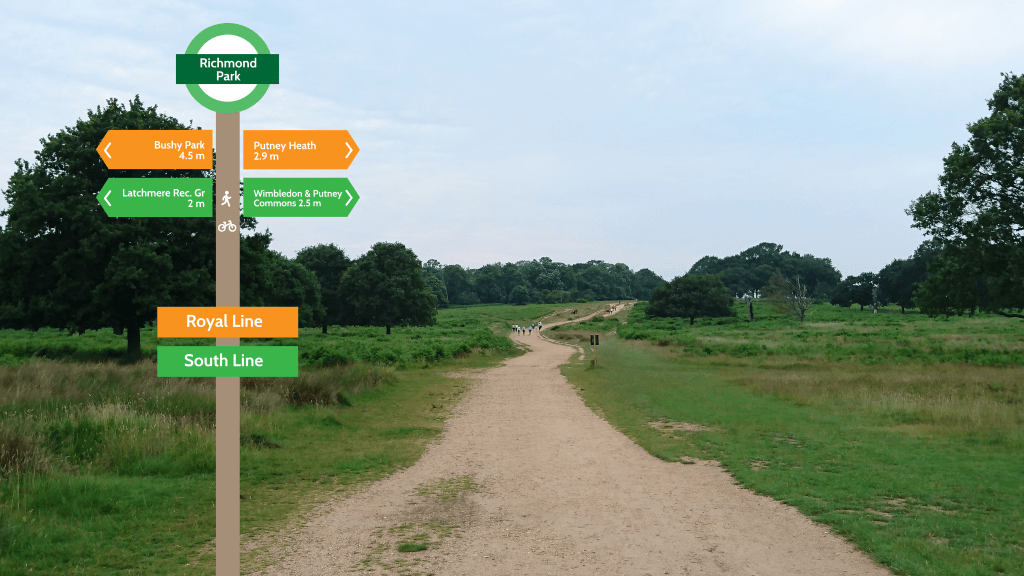 If the idea of continuous pavement line network across London seems too out there, then another option could be more traditional wayfinding system with sign-posts in the centre or at the entrances of the green space. As the core idea of the Greenground is to travel through and between the parks, then maybe in the centre rather than at each entrance. Also, I measure the distance between the parks from approximate centre point of the park. As some of the parks are huge and the Greenground diagram shows circles I think this is the only way to do this if the walkers and cyclers aim to travel from park to park.