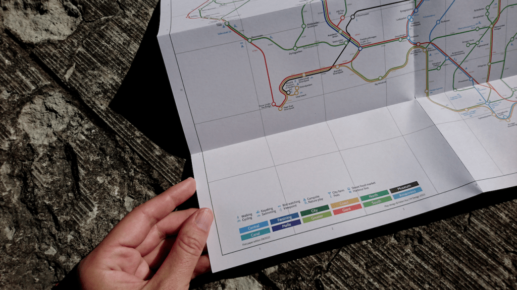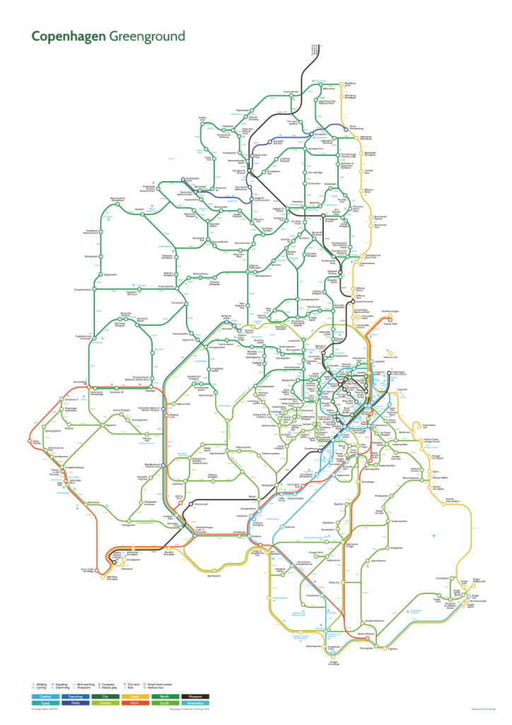 As usual the Greenground Map does not map the transport network, but it shows where to go! The map connects the parks and interest points to give you the oversight of the city based of its landscape and natural connections, so the Copenhagen becomes an intertwined network of canals, rivers, green paths, nature reserves and coastline. It will change the way you’ll perceive the city and helps finding interest points outside the centre, whether these are forests, hill-tops, beaches or even giant wooden trolls!