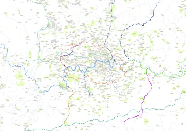 The final map includes layers with OS Open Greenspace and OS Open Rivers information, GPX trails from various open online sources, 800+ parks and open spaces from the 2021 London Greenground map and London Boroughs from TFL Open Data Hub.