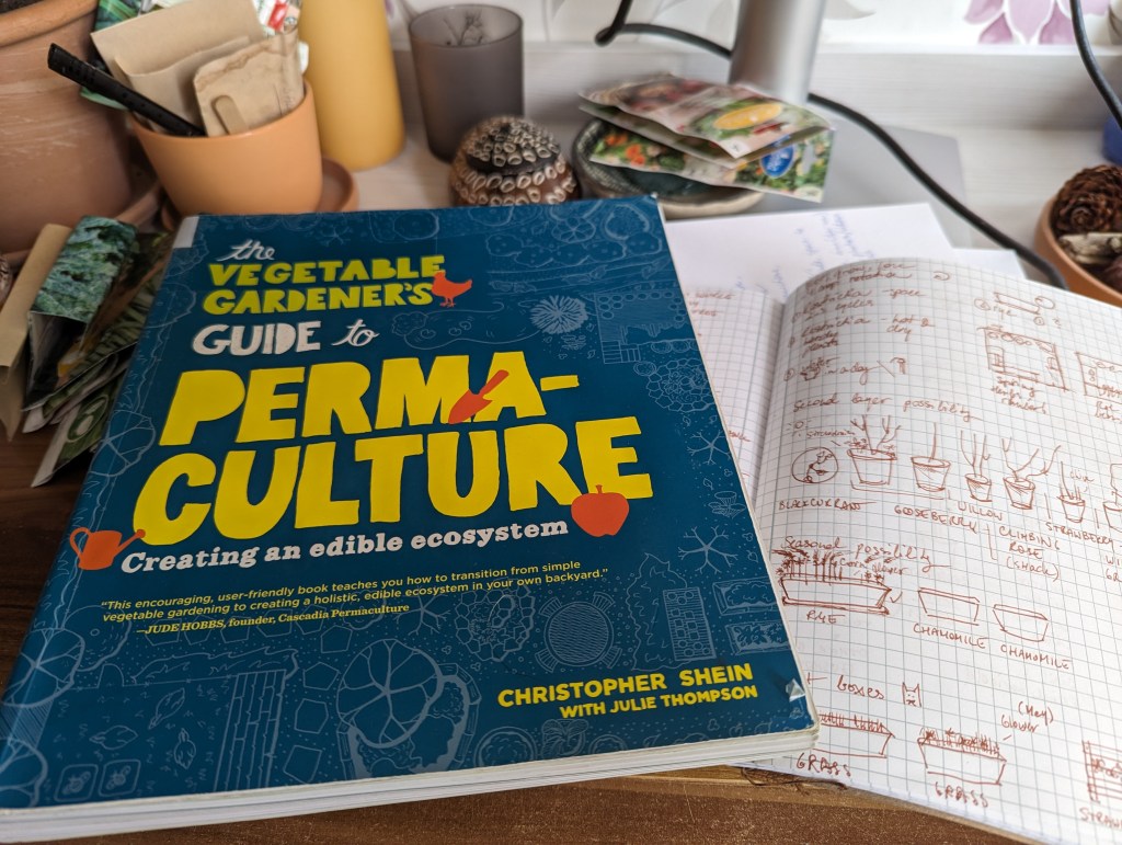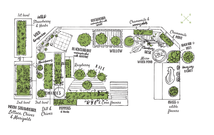 After taking the online permaculture course last month I got quite interested in companion planting and how to underplant the fruit bushes with a layer of greens and herbs to maximise the space and have more variety of edibles (last year I mostly ended up with grass and weeds). I also picked up a bit older permaculture book from my local library and although it’s mostly meant growing in larger spaces, I really liked, how they designed their balcony garden. So I had a go at sketching one myself!