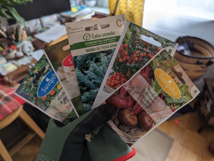 The winter returned in the second half of March for two weeks (snow and all) and as we had no sun, I was worried my dill sprouts will wither and die. I don’t have a grow light yet, but I ended up placing a fan nearby, so they could get some air circulation and exercise (they did look very pale and leggy). But once the sun returned the sprouts improved and once I started to take them outside during the day, toughened up considerably. The parsley had a lot better start and is looking really good already. And after a trip to the garden centre I now have few more seeds to sprout!