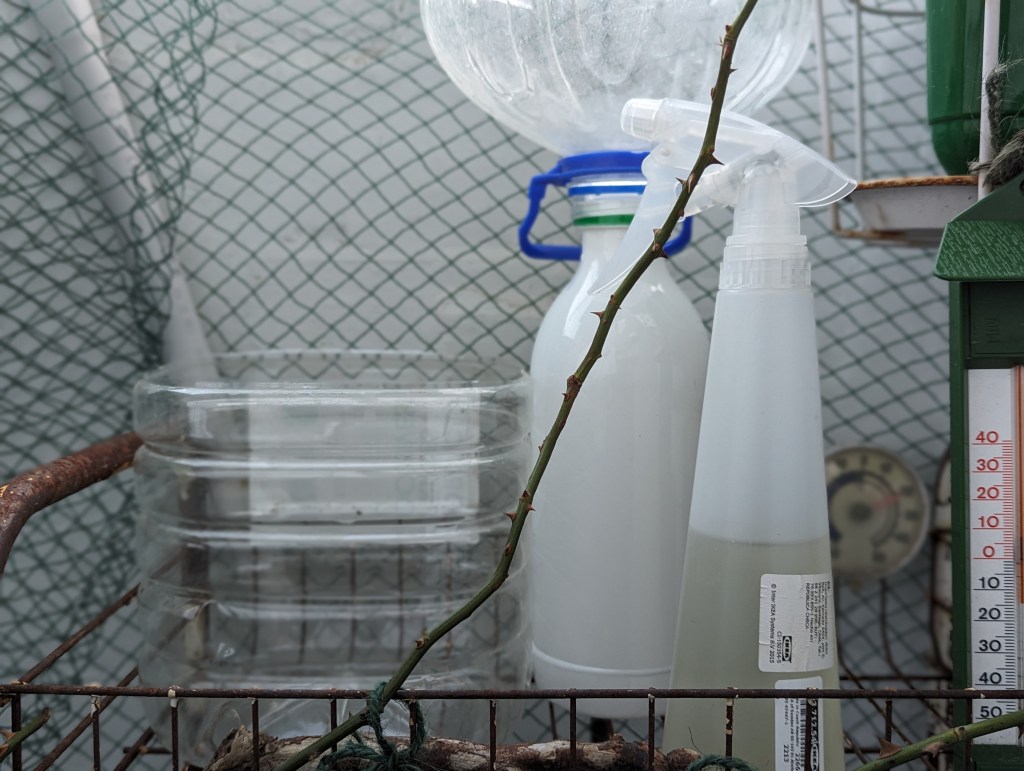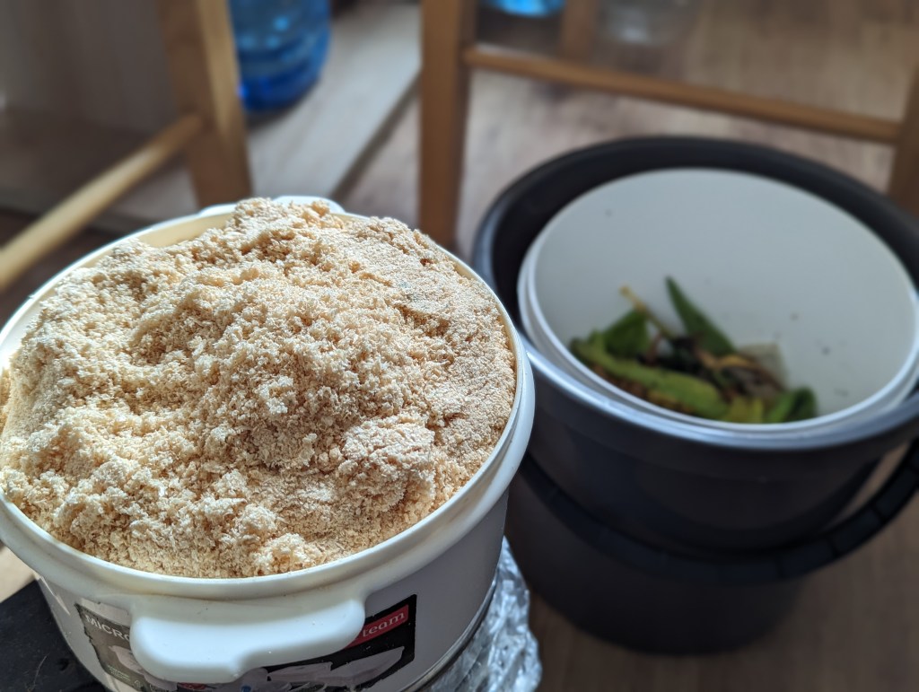 As I finished the sketch I realised it didn’t really look like a permaculture garden yet as I still hadn’t thought much of the regenerative side of things. So I ended up making a very basic rain-water collection system (not sure how much it will collect as I have a closed balcony) and also had a go at making a bokashi bin. I prepared the bran two weeks ago and when I opened it up it did have few specks of blue in it, but I decided to give it a go anyway as the smell was nice. In worst case of scenario I will end up with a good looking waste or if this is working (fingers crossed), will have a nutritious base for my rhubarbs!