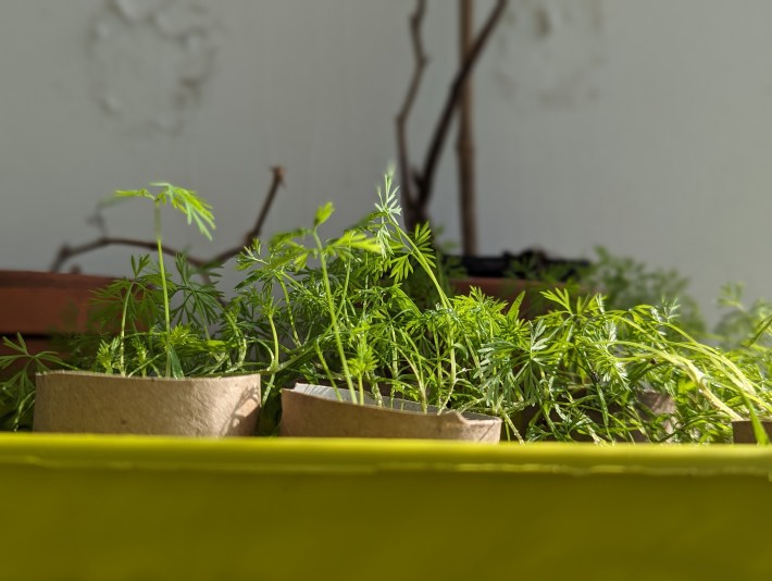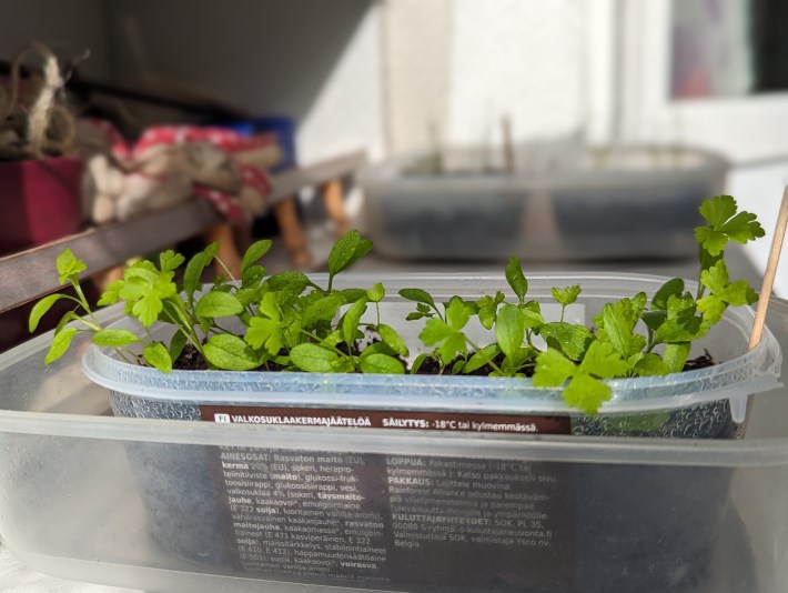 Parsley sprouts in the recycled ice-cream container